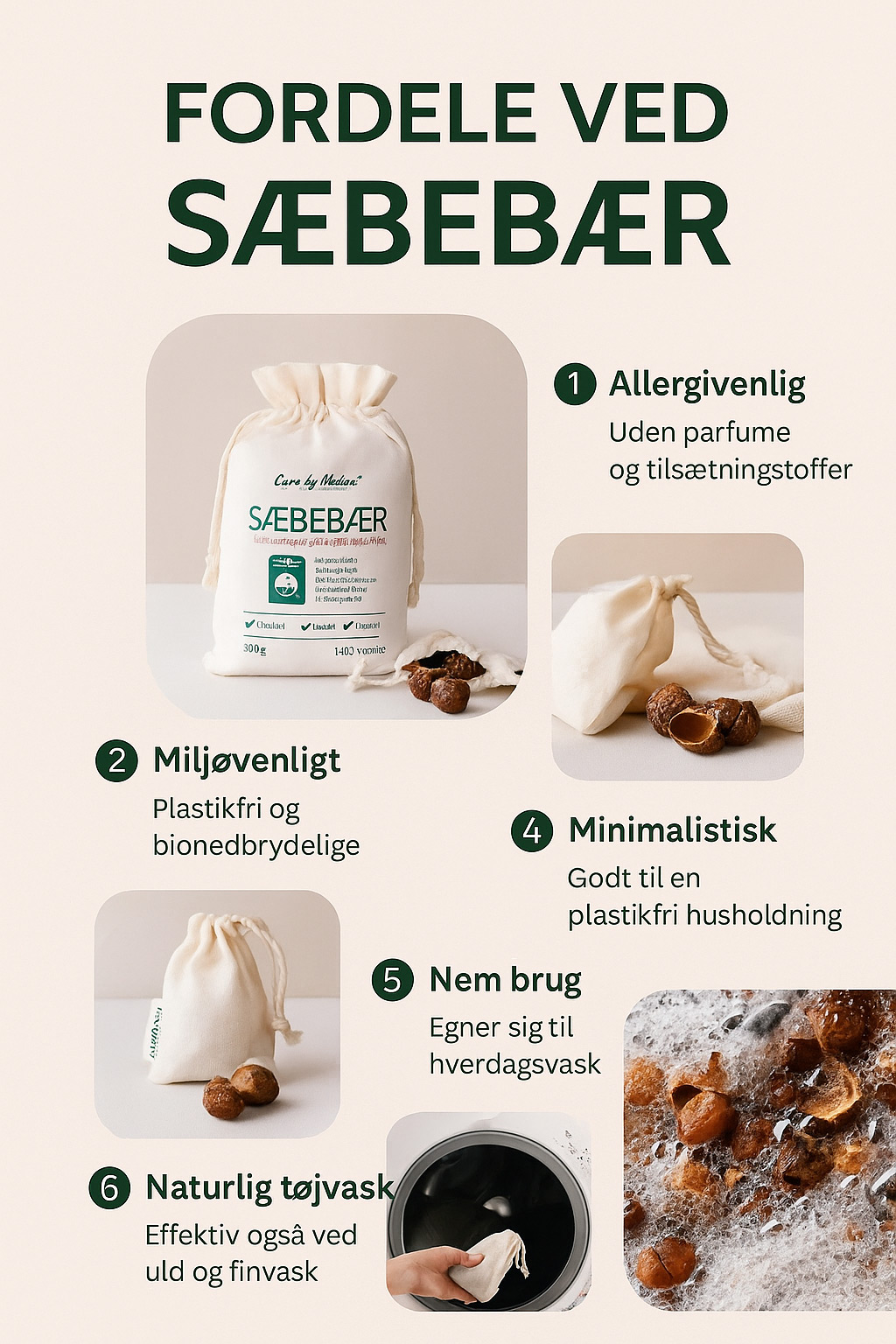 Sæbebær indeholder naturlige saponiner, der frigives i kontakt med vand og fungerer som sæbe. De vasker effektivt ved almindelige temperaturer (30–60 °C), og er især velegnede til hverdagstøj, uld, finvask og babytekstiler.